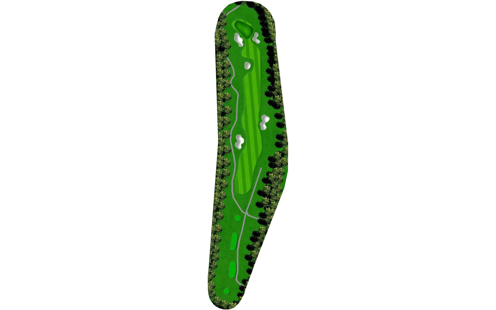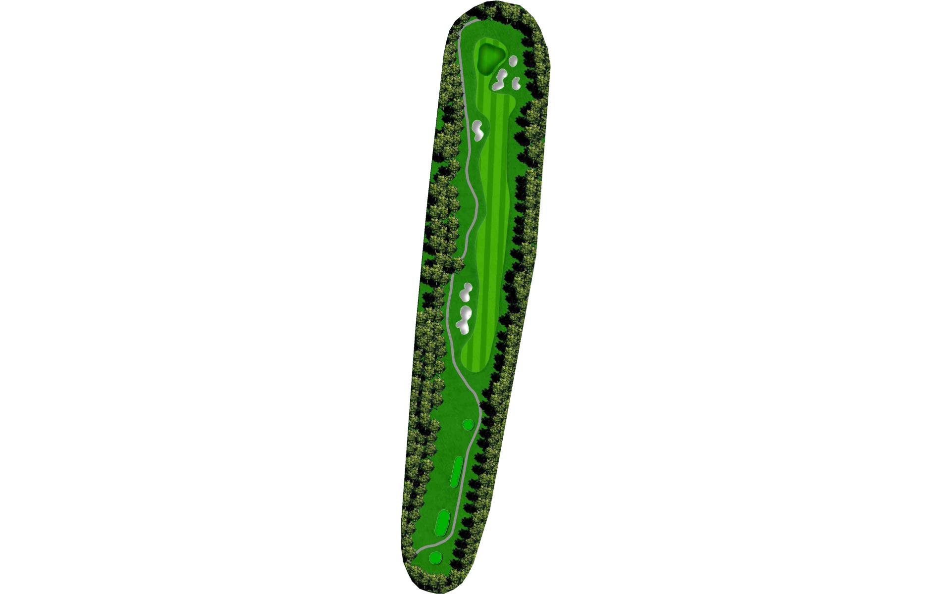 This dogleg left par 4 requires a tee shot, from the black tees, of about 200 yards and favoring the right side. The approach shot travels over a green to a green with two bunkers on the left side.