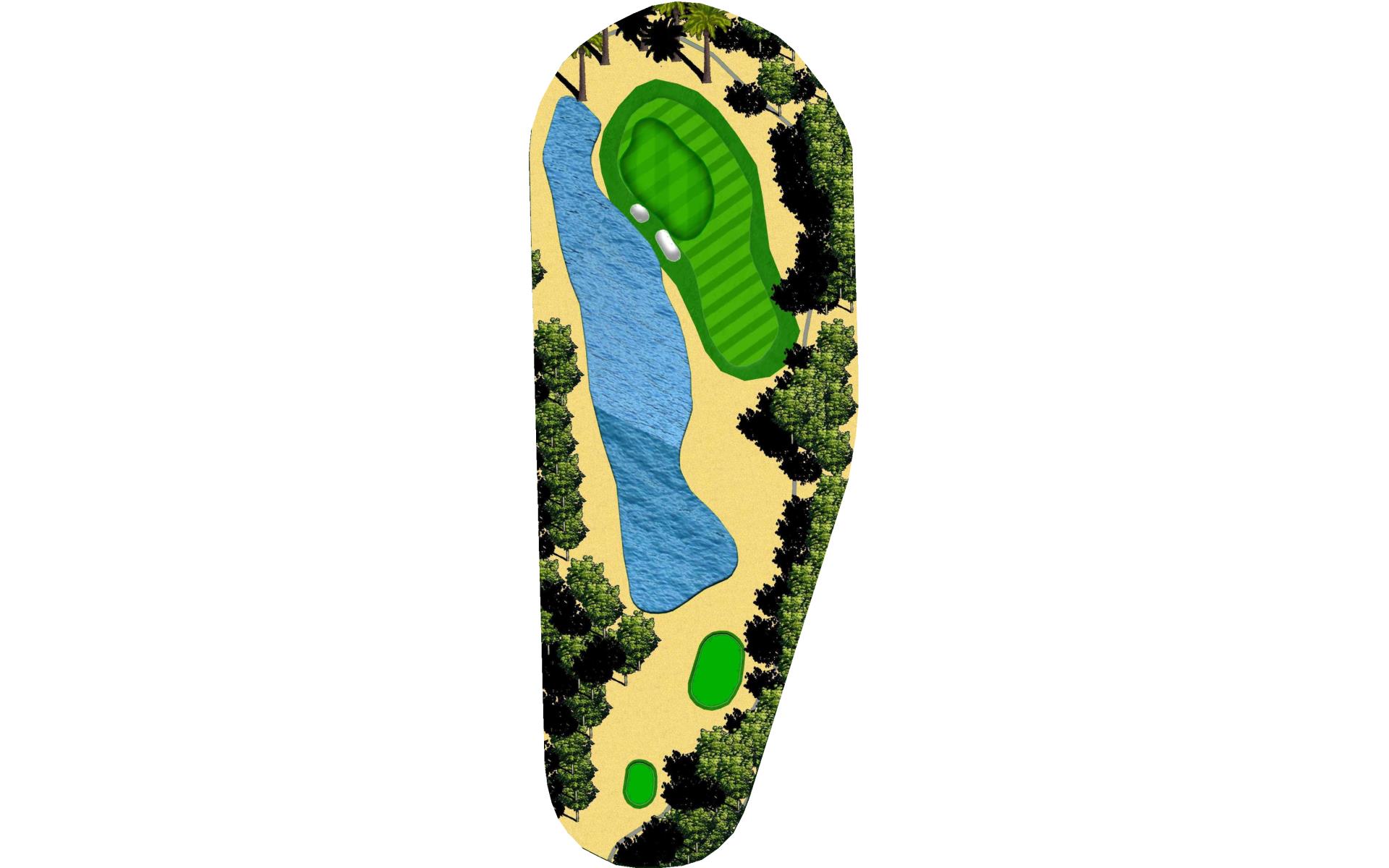 Par 3 over a pond- the hole will play approximately 140 yards from our men’s tee and 110 yards from our ladies tee. The putting green is guarded by two bunkers- short left and right of the putting green. Putting Green runs back to front and left to right. *Player Note: there is more room over the short left greenside bunker than you think. Middle of the green is always a great spot to putt from on this hole for any pin position.