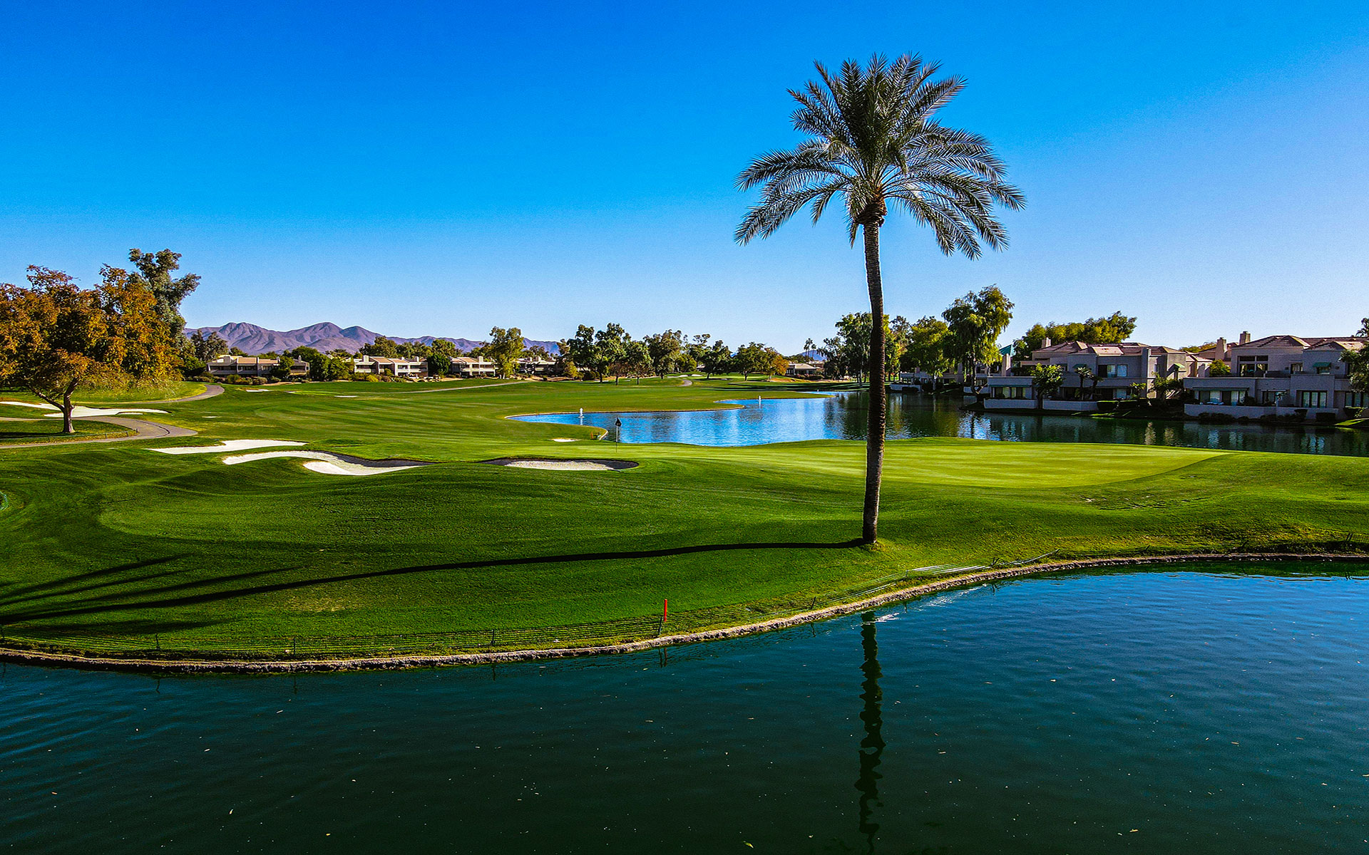 A great finish to the Arroyo Course, this demanding risk/reward par 5 plays along the lake - all the way down the left side of the hole to the undulating peninsula green.