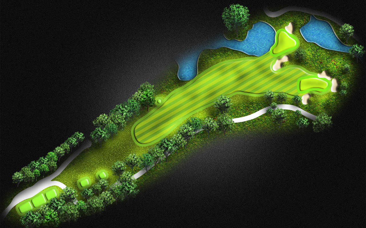 A demanding tee shot on the Par 5 is crucial. You must lay up between the water on the right and left. Long hitters will have a chance to get to the green in 2.