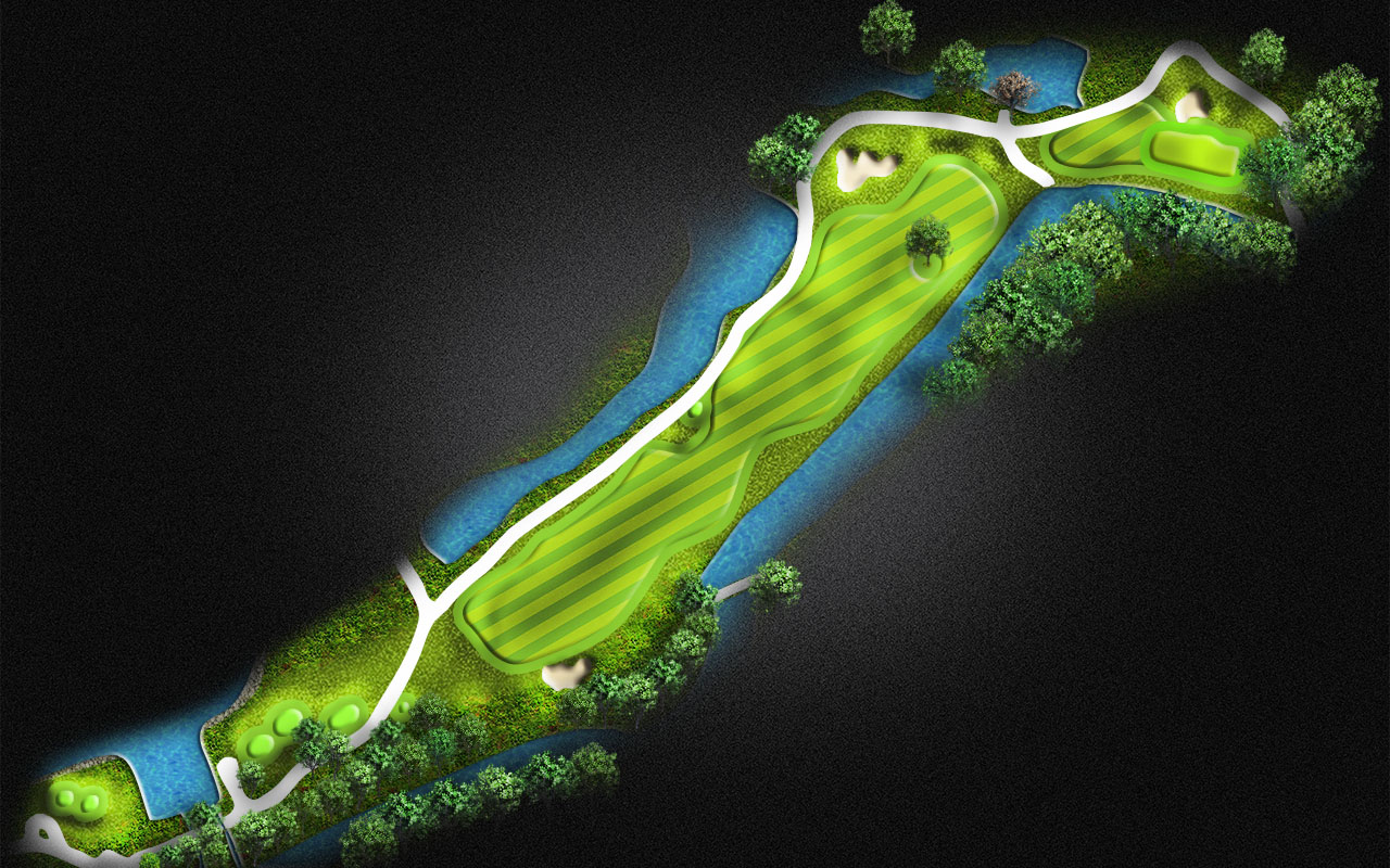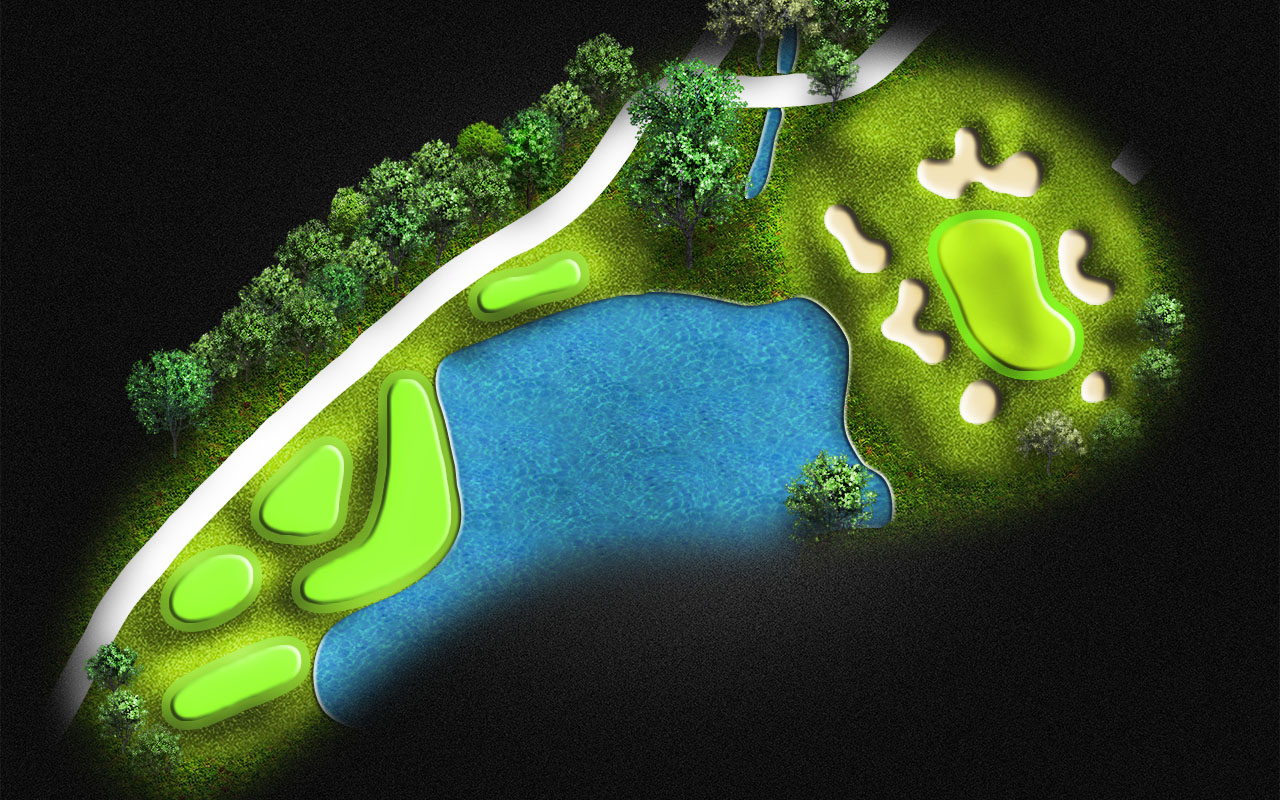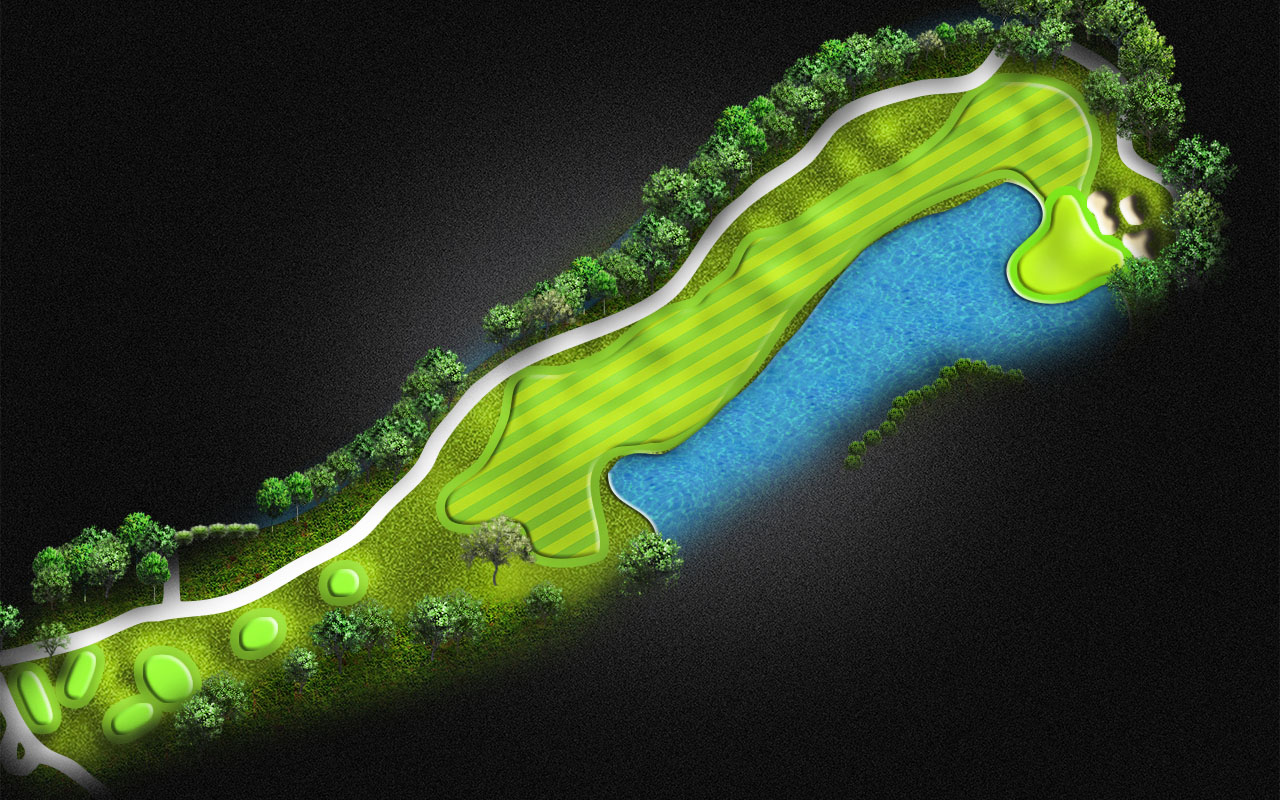 A demanding tee shot between 2 waters still leaves you a tough mid iron to the green surrounded by water on both sides. Drive it to the 150 yard marker gets you started on the last hole of the day.