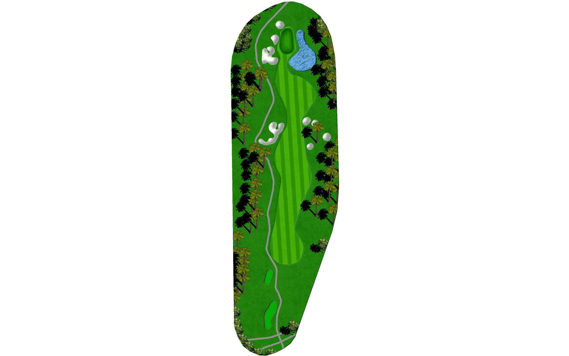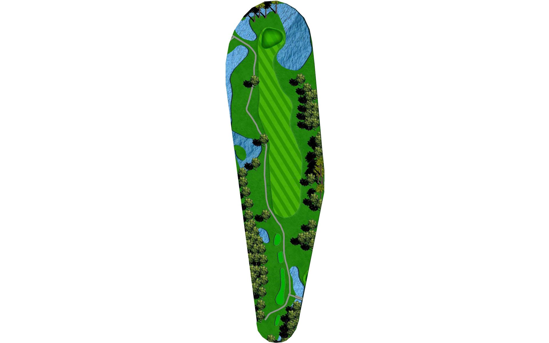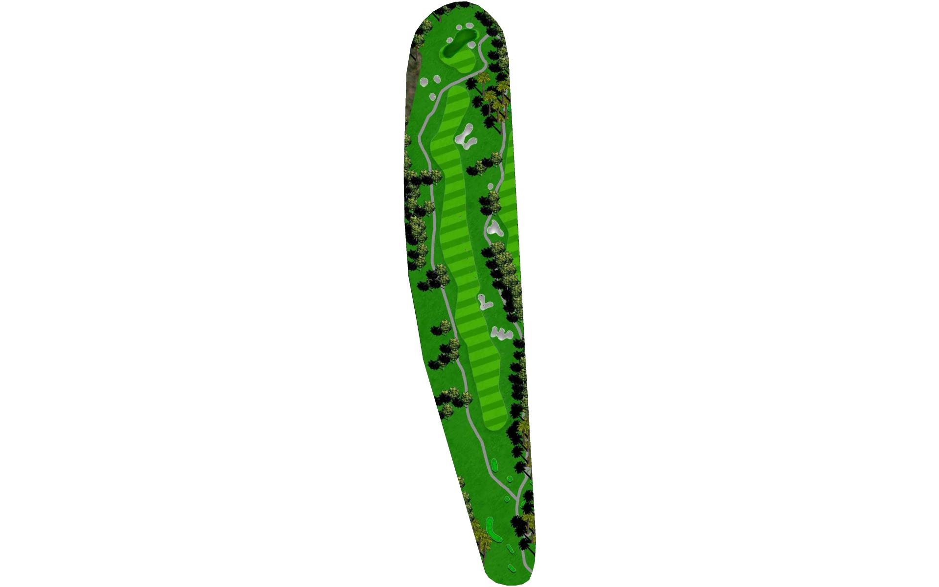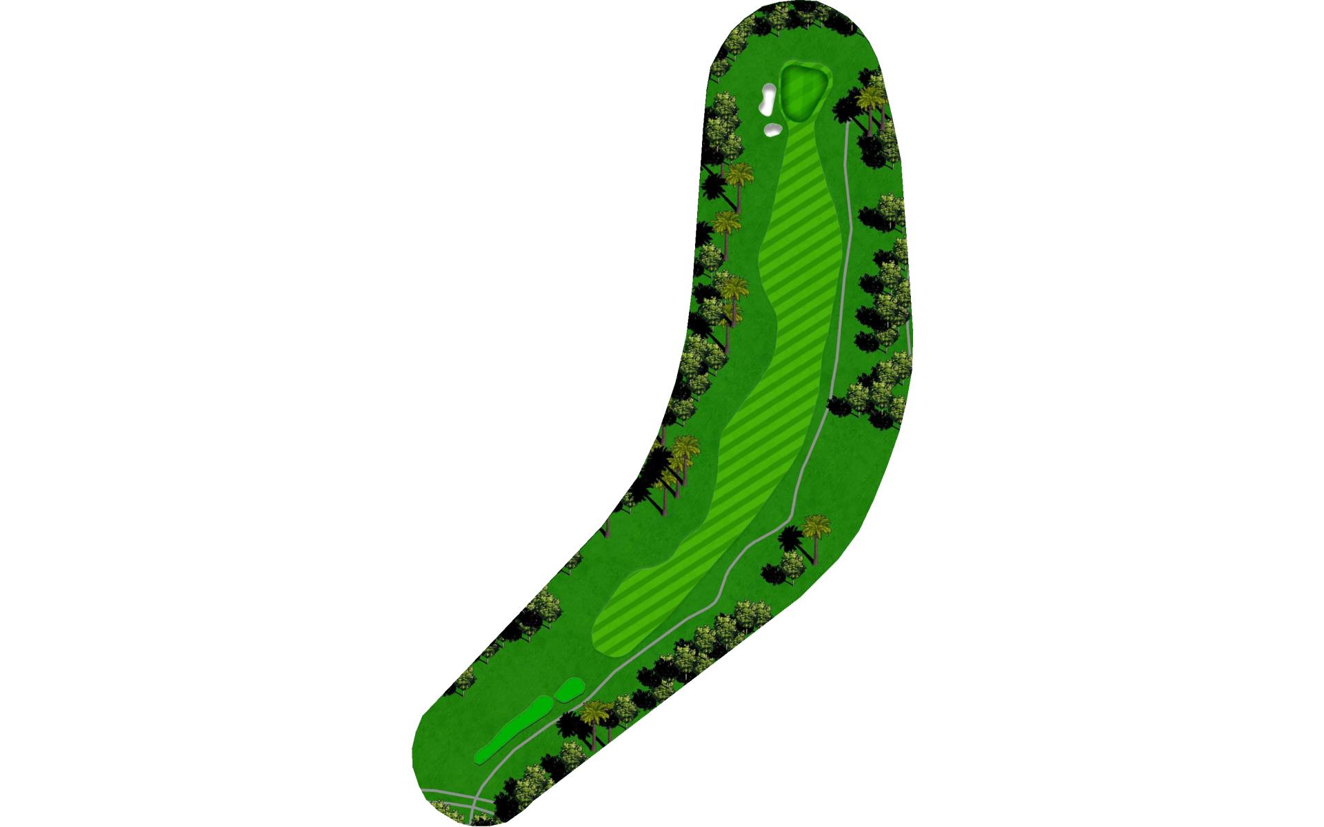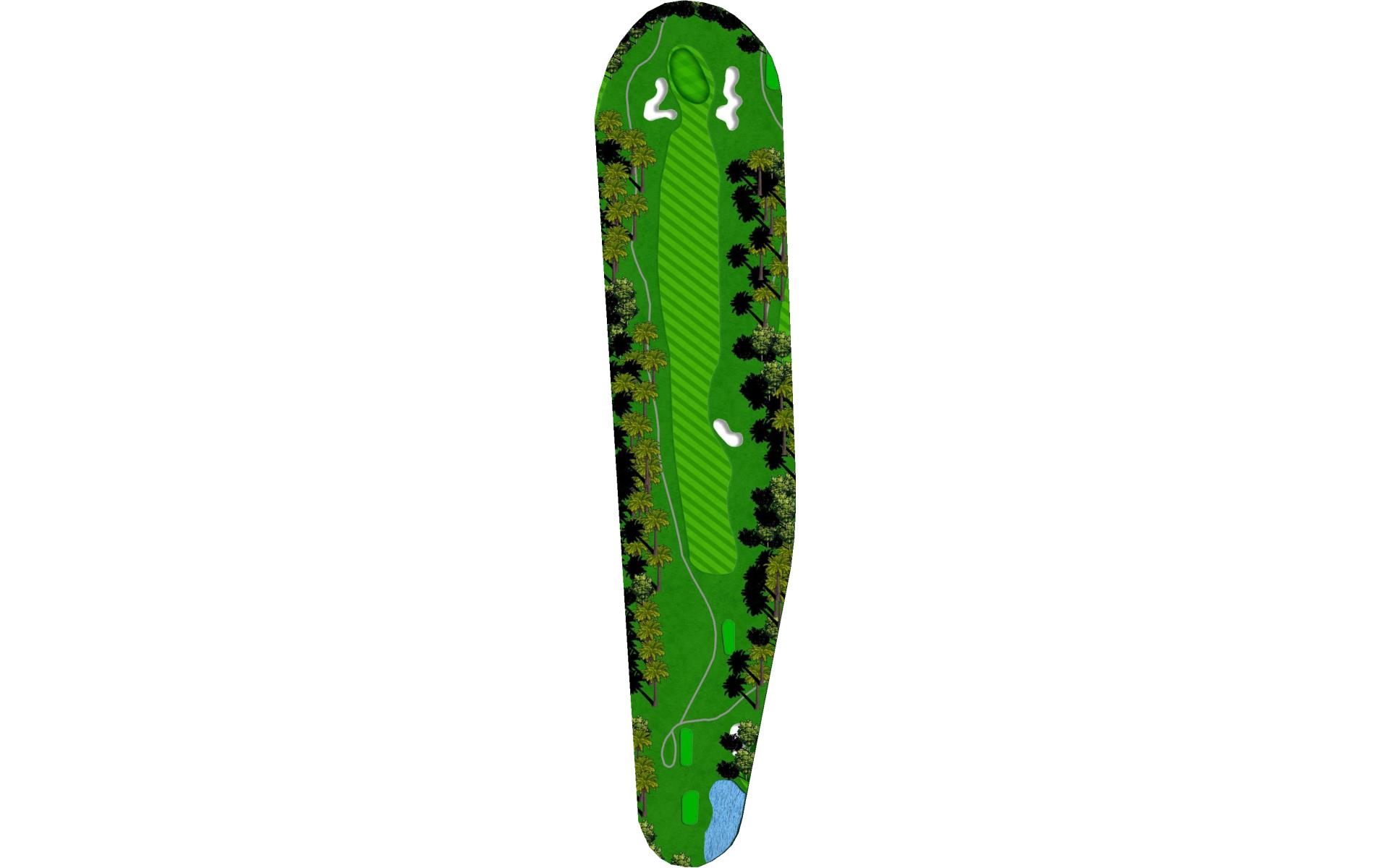 A long iron or 3 wood won't hurt here (bowling alleys are wider than this palm tree-lined fairway!). Stay short of the water and your third shot will find the green without a problem.