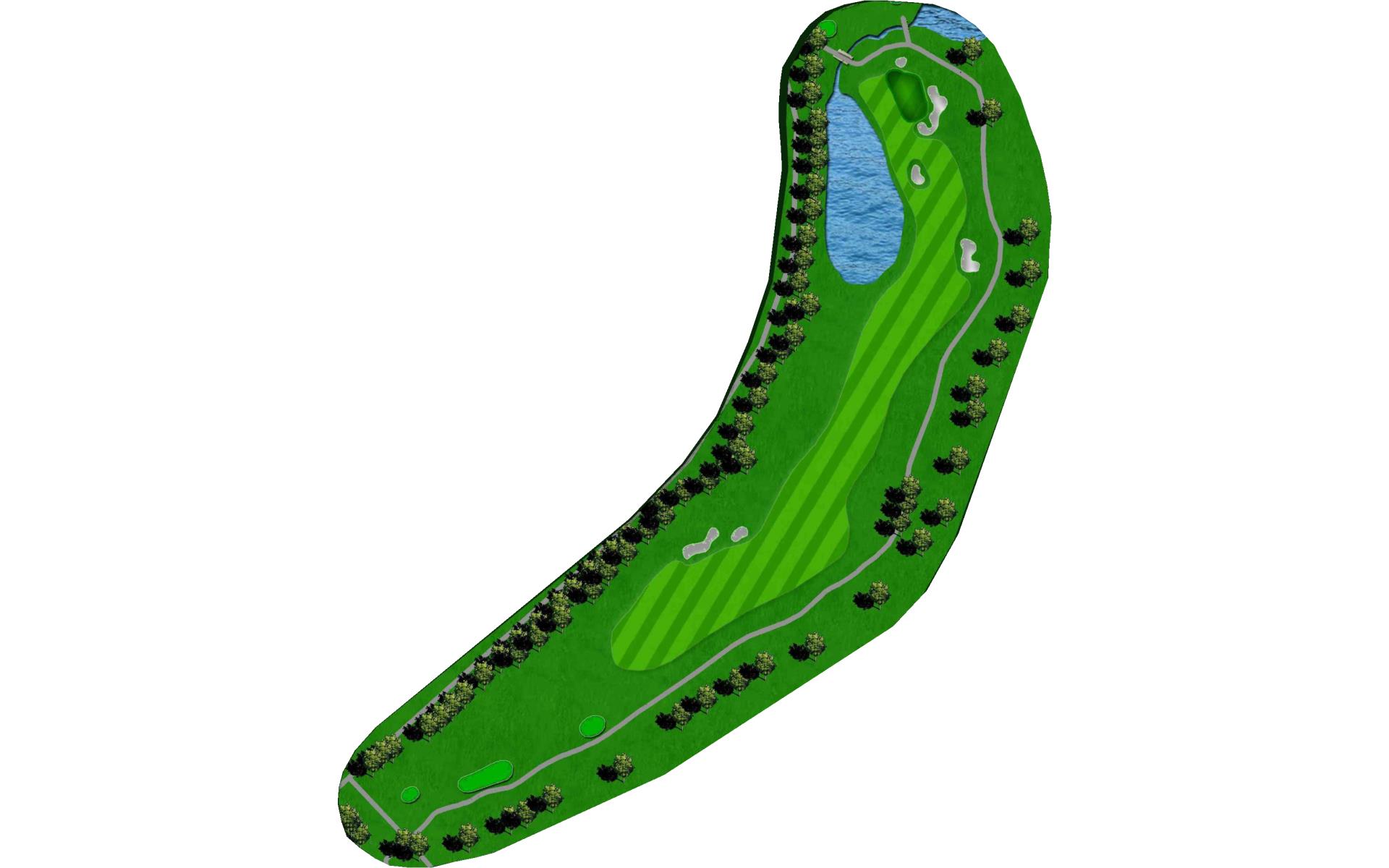 | This long dogleg left par 4 requires players to carry the water on their drive to a landing area flanked by fairway bunkers. The approach shot must avoid the large greenside bunker on the left. |