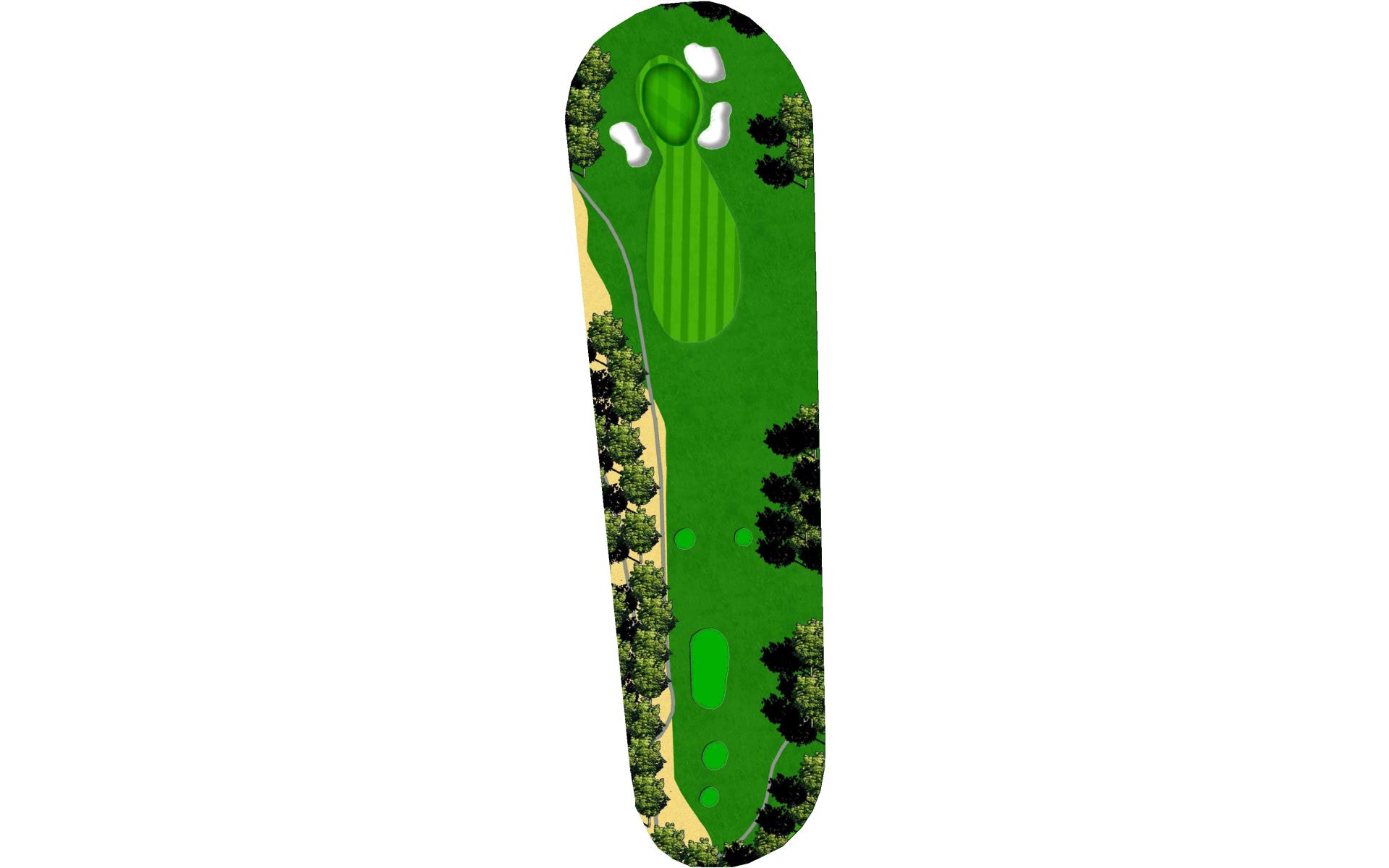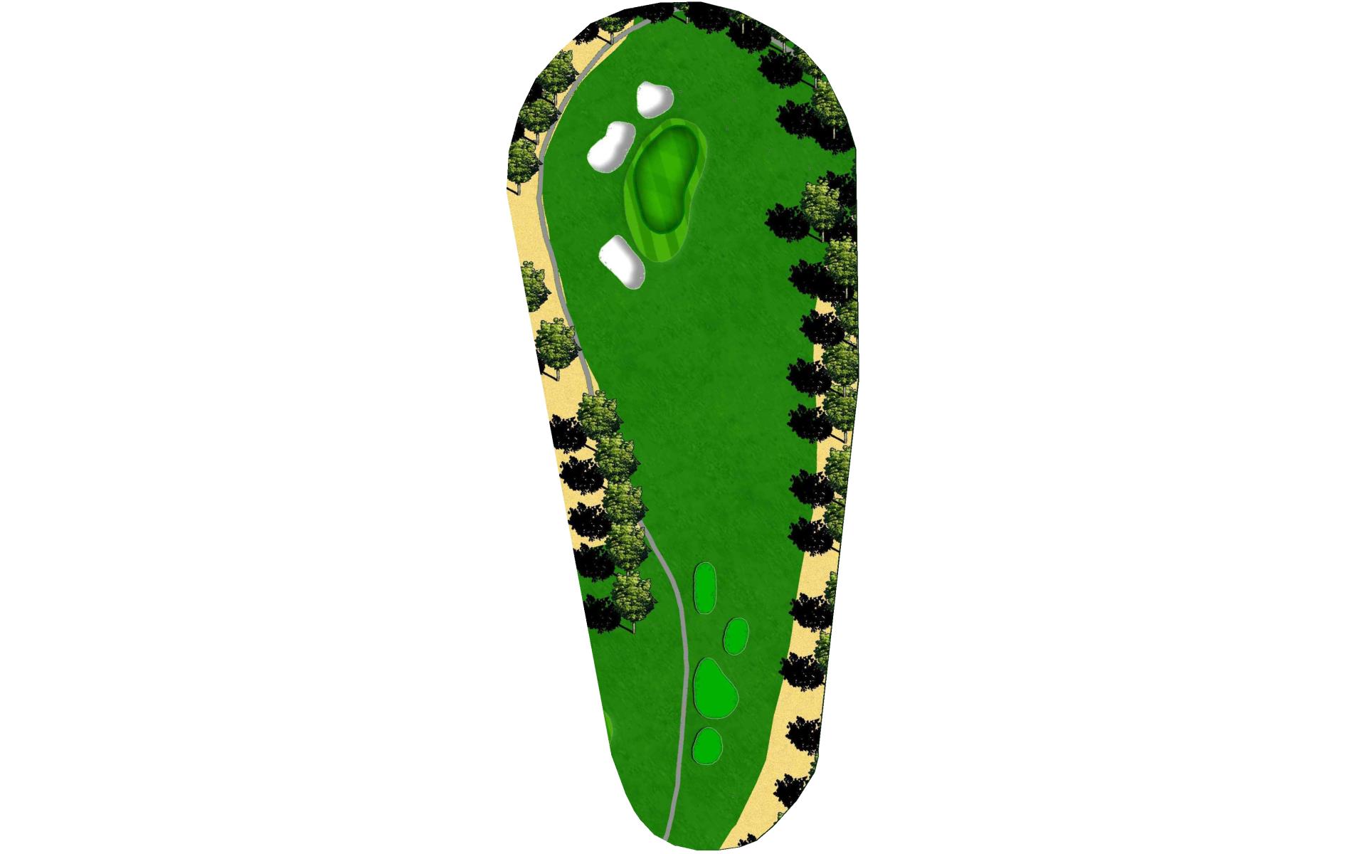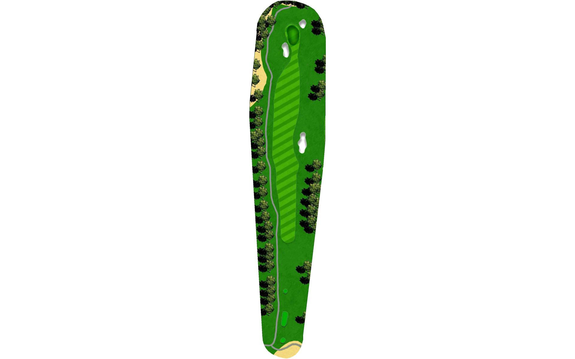 A slight dogleg right forces you to either try for distance plus accuracy to get very close to this green, or lay back to a more open area short of the grove of trees which will allow a full shot with a short iron to the steep green. Beware the out-of-bounds left and right.