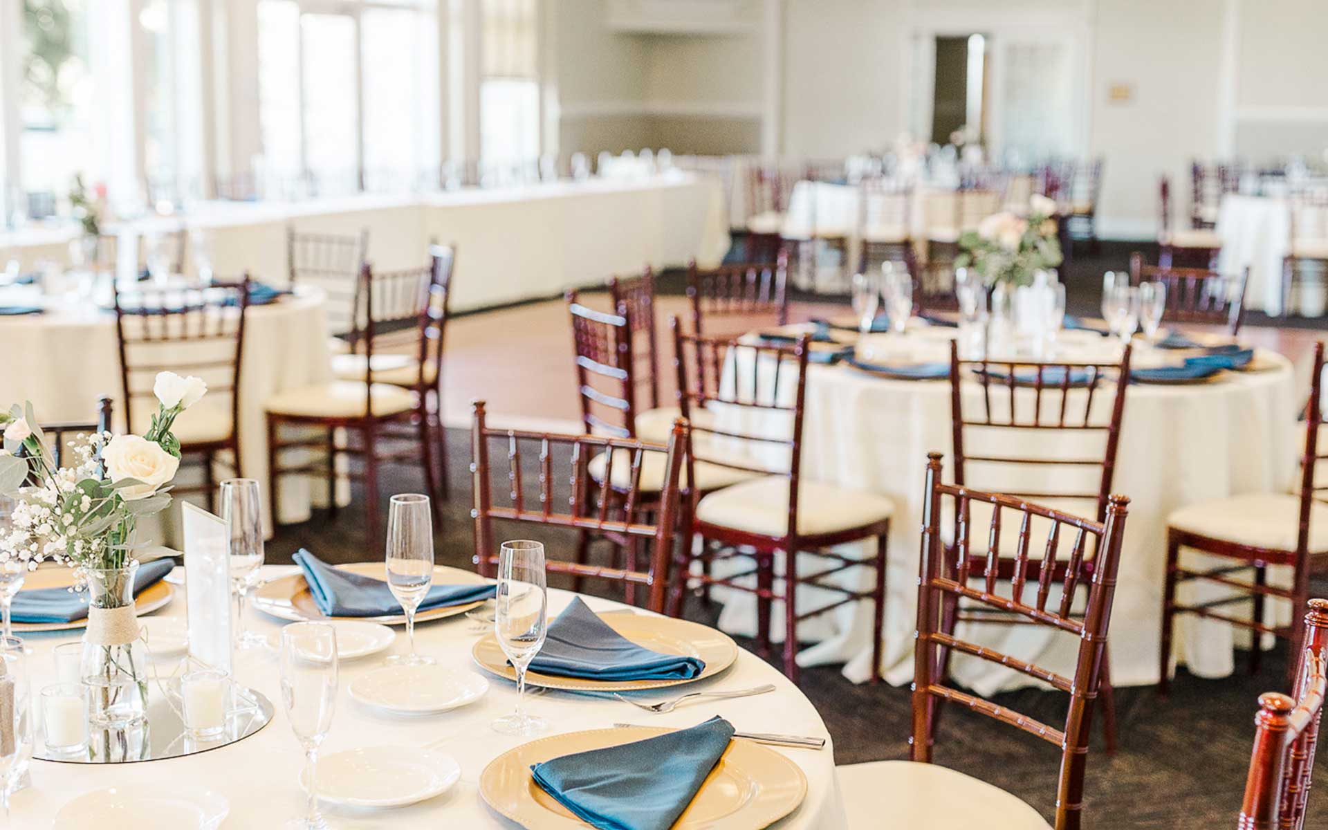 The Ballroom can accommodate up to 200 guests with a large, dark wooden dance floor. This room can also be portioned off to accommodate more intimate-sized groups. The Ballroom features floor-to-ceiling windows with a breathtaking view of our 18th fairway and expansive back patio.