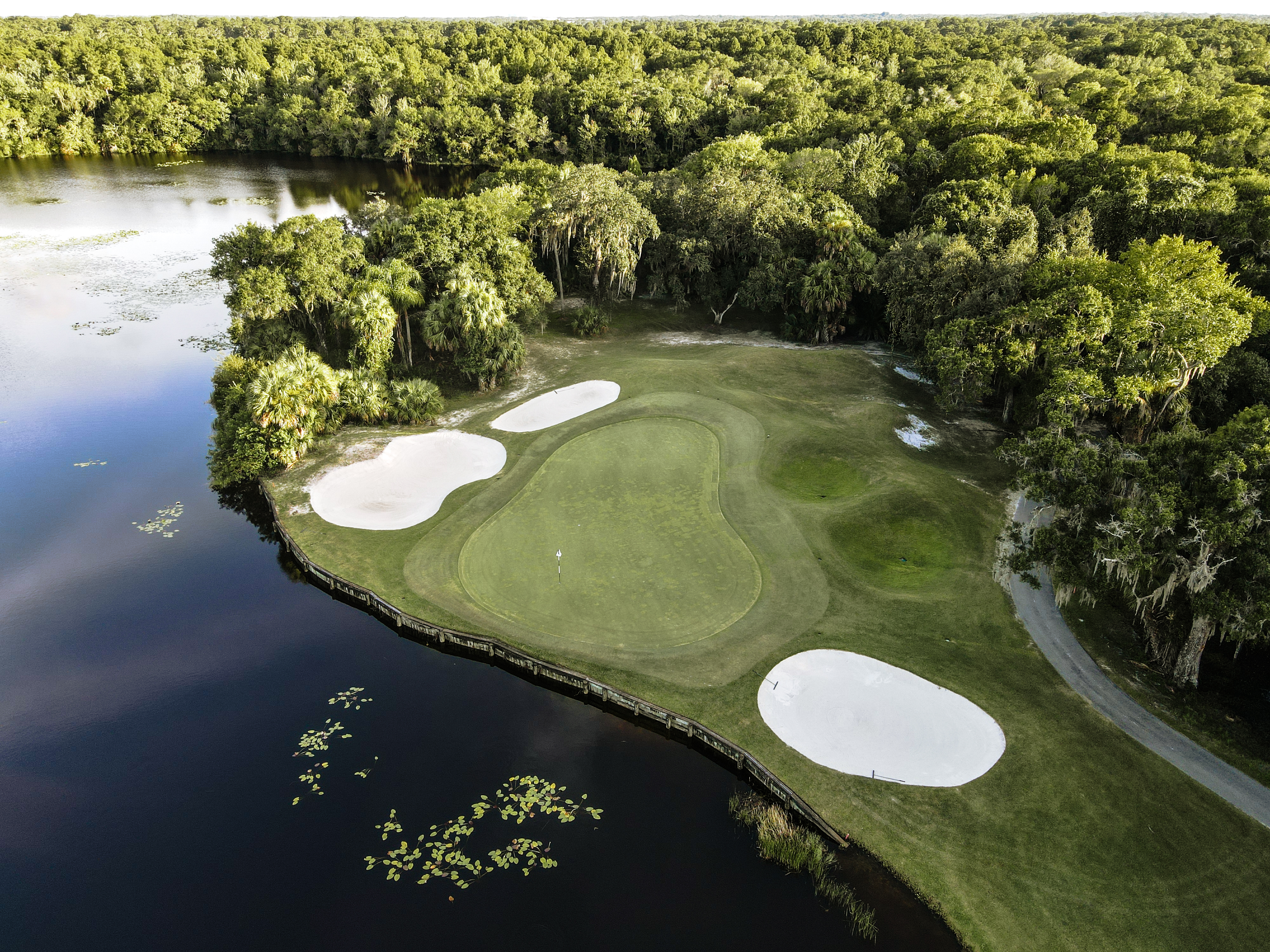 | Although not a long finishing hole, this hole requires two solid shots, both of which must navigate a lake. The lone fairway bunker is your aim point off of the tee. Pick a club to get it as close as you can to this bunker and you will have set yourself up for a short- to mid-iron into a severely sloped green protected by a bunker left and water everywhere else. The approach shot finishing above the hole here will leave you with a speedy downhill putt, so do your best to leave it below the hole. |