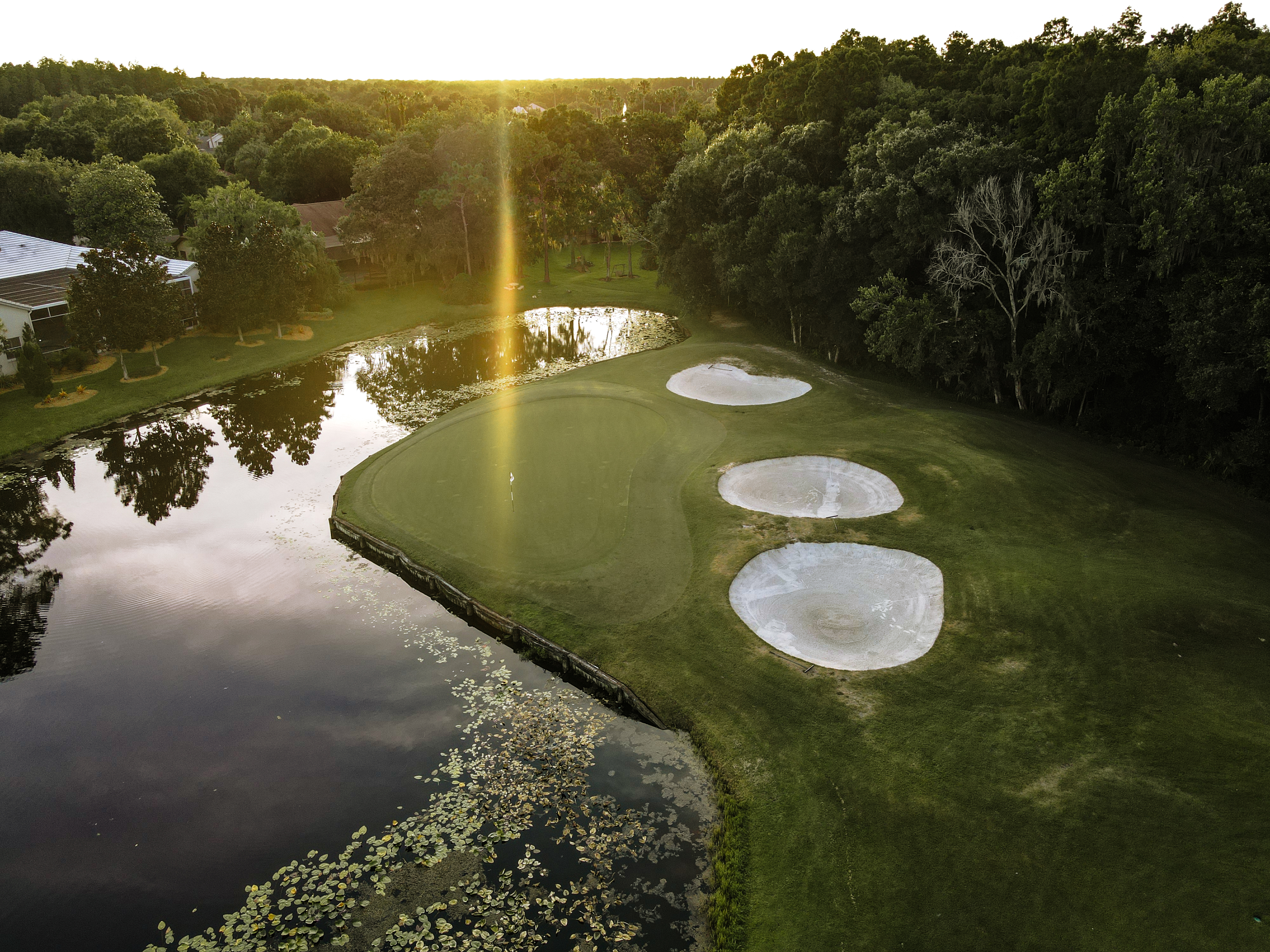 | Our signature hole is a visually beautiful hole but requires a tee shot that flies the lake short of the green. The green runs diagonally from front left to back right, and tee shots pushed right often come up short in the water. Be sure to take enough club on the tee shot and you'll have a good chance at birdie. |