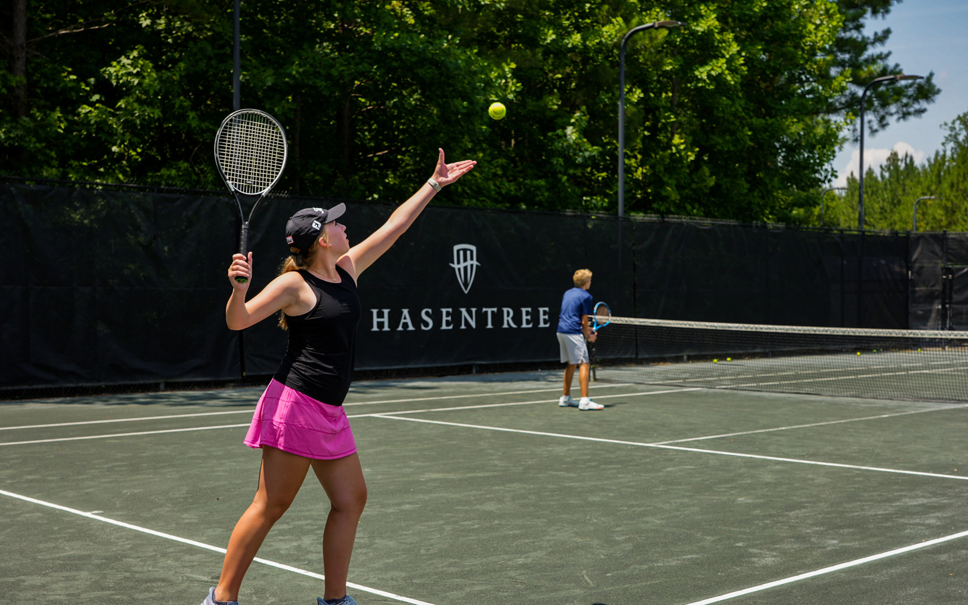 At Hasentree, we have three pools, including a six-lane, 25-yard competition pool and a zero-entry children's splash pool with interactive features, as well as the "Hasenator," a 90-foot, double-loop water slide for kids of all ages. In addition, all swimmers 18 and younger can join our swim team, the Hasentree Hammerheads, to participate in the Tarheel Swimming Association, North Carolina's largest summer recreation youth swim league.